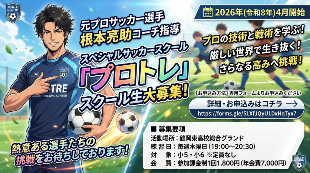庄内FCアカデミーでは、2026年(令和8年)4月より、当アカデミーアドバイザーであり、元モンテディオ山形のプロサッカー選手・根本亮助コーチによるスペシャルサッカースクール**「プロトレ」**スクール生を募集いたします。